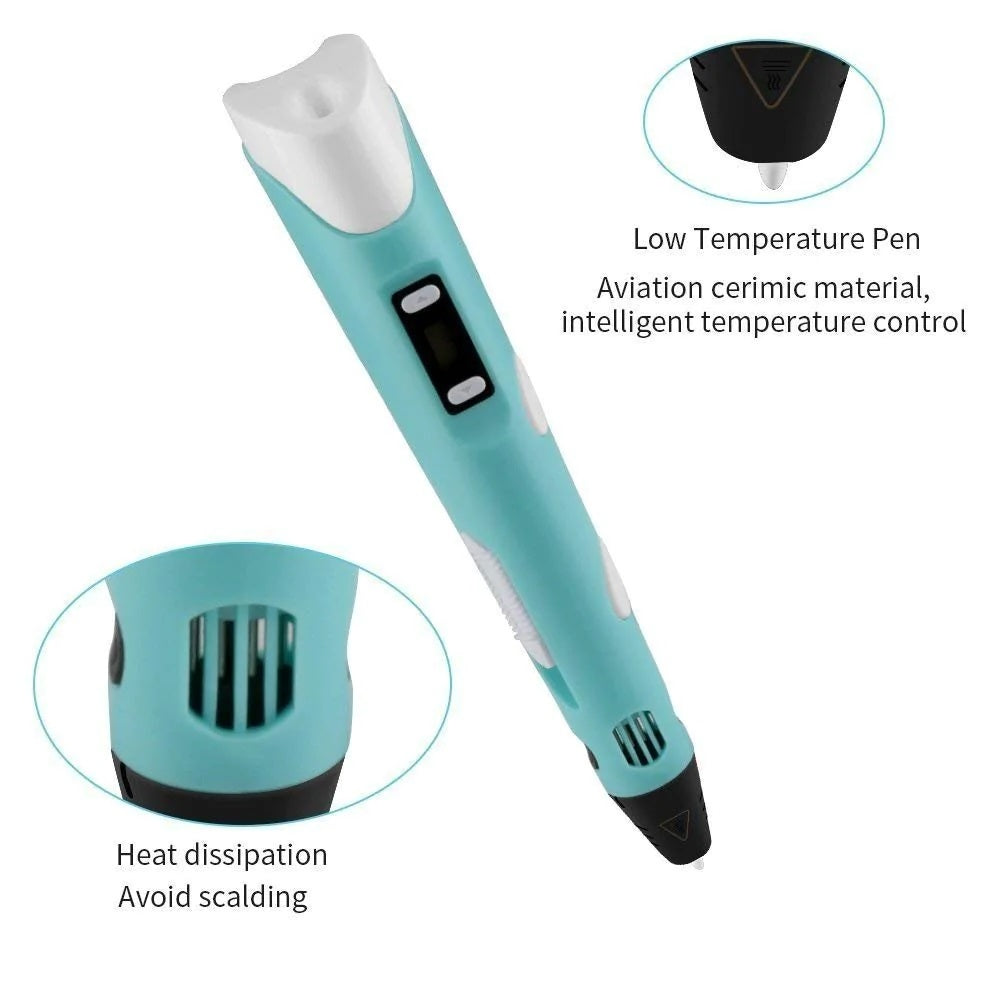Cu ajutorul creionului 3D, puteti desena in spatiu, realizand astfel obiecte 3D. Are un design ergonomic pentru a fi folosit cu usurinta in timpul desenarii. In pachet sunt incluse 3 filamente cu culori diferite, iar acestea pot fi schimbate cu usurinta apasand doar un buton. Modelul prezentat are afisaj electronic care indica temperatura. Lasati aparatul sa ajunga la temperatura optima si incepeti sa desenati in spatiu!