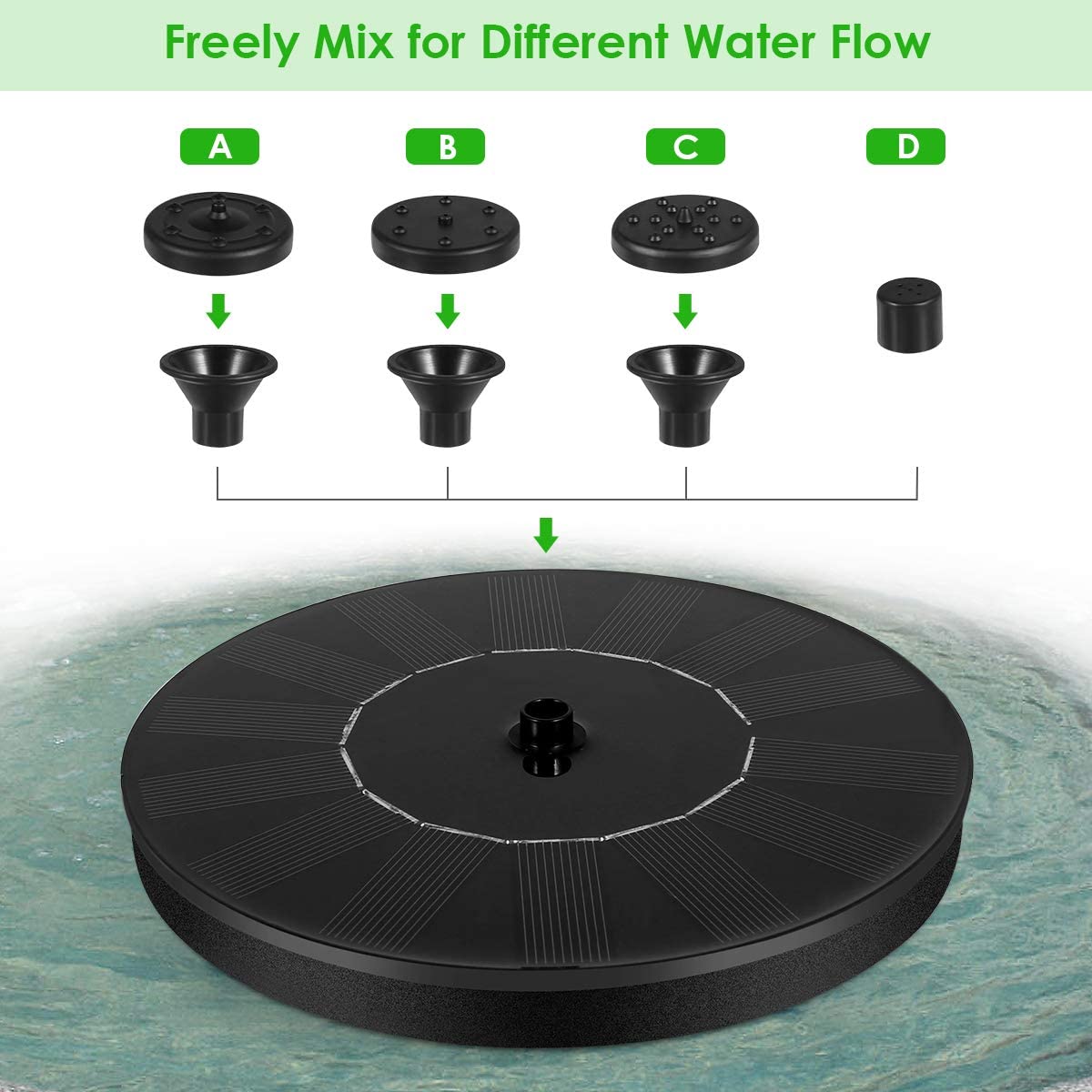 - 4 duze - Fantana solara vine cu 4 accesorii, pentru forme si modele diferite de pulverizare dorite. Inaltimea de pulverizare poate ajunge pana la 40 centrimetri in functie de puterea razelor solare.