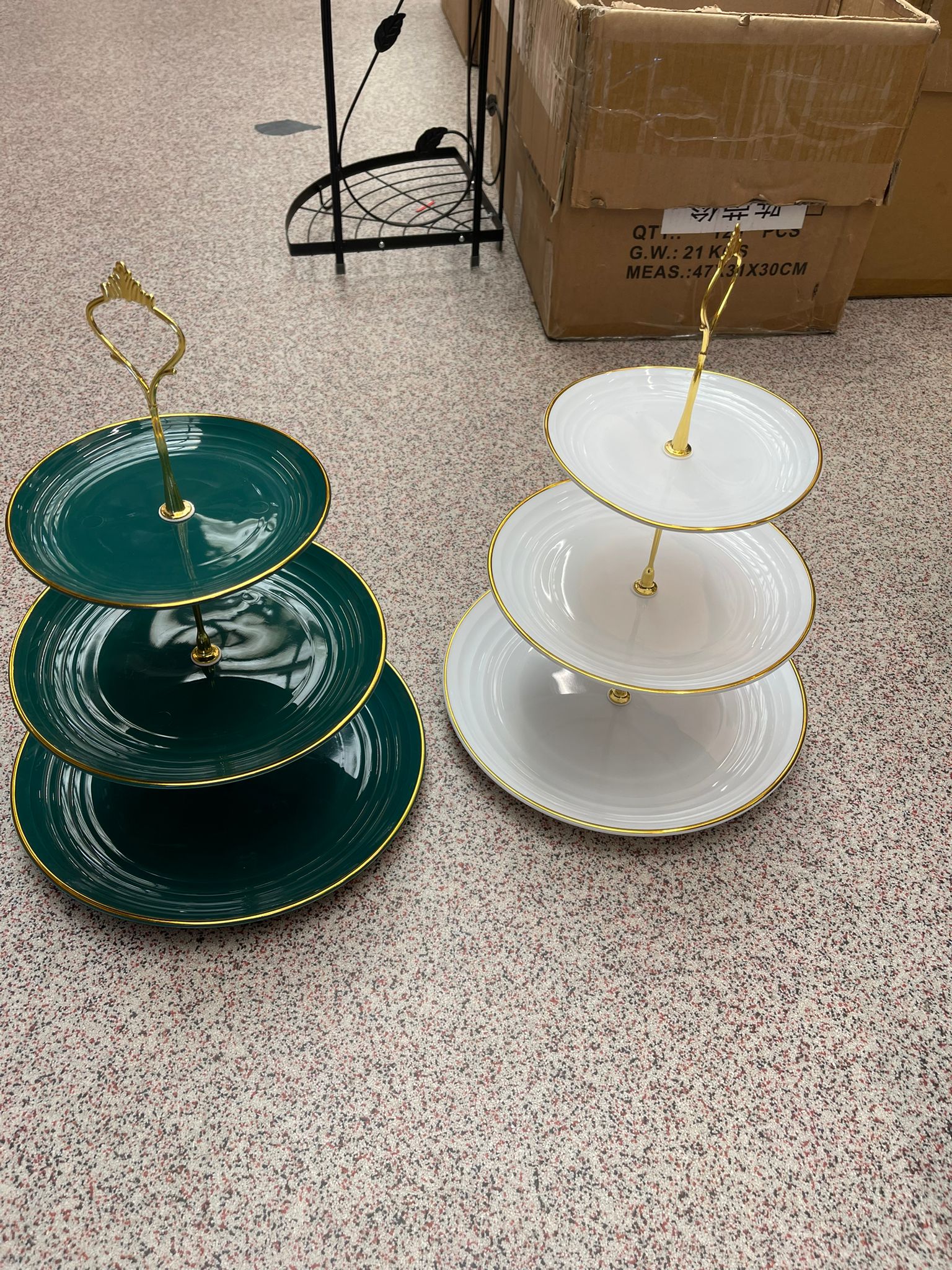 - Model:3 platouri din plastic, de dimensiuni diferite, cu margini dantelate pozitionate pe 3 nivele, cu ajutorul unei tije de plastic de culoare aurie, ce trece prin mijlocul celor 3 platouri. Tija suport are terminatia in forma de inel elegant