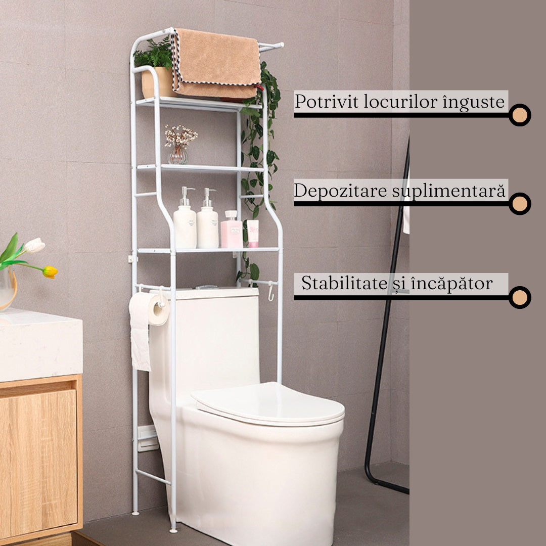 Alcatuit dintr-un cadru si cateva accesorii, raftul de depozitare este extrem de durabil si stabil. Organizatorul foloseste spatiul neutilizat de deasupra toaletei, creand mai multe spatii suplimentare de depozitare unde puteti depozita detergenti lichizi sau solizi, sampon, gel de dus etc. Va va ajuta sa va organizati mai bine baia supraincarcata sau spalatoria. Raftul de expunere este usor de asamblat cu ajutorul instructiunilor detaliate din pachetul de livrare.