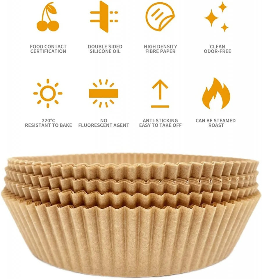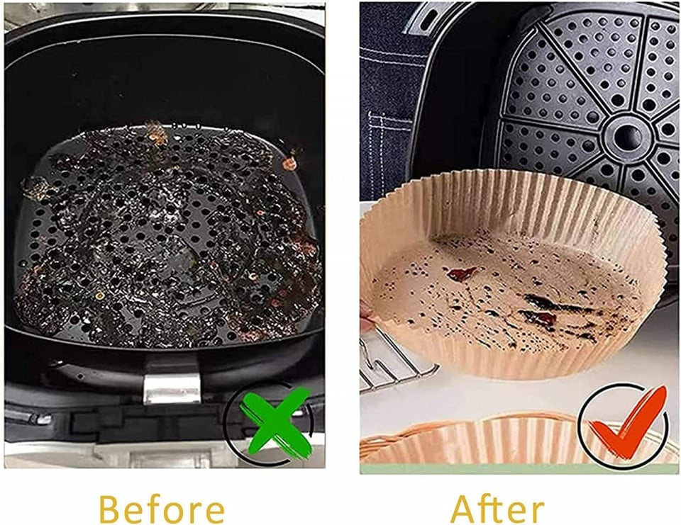 Hartiile de copt sunt taiate in dimensiuni adecvate pentru a se potrivi cu friteuza ta. Ele se potrivesc bine in cosul friteuzei, oferind o suprafata de coacere uniforma.