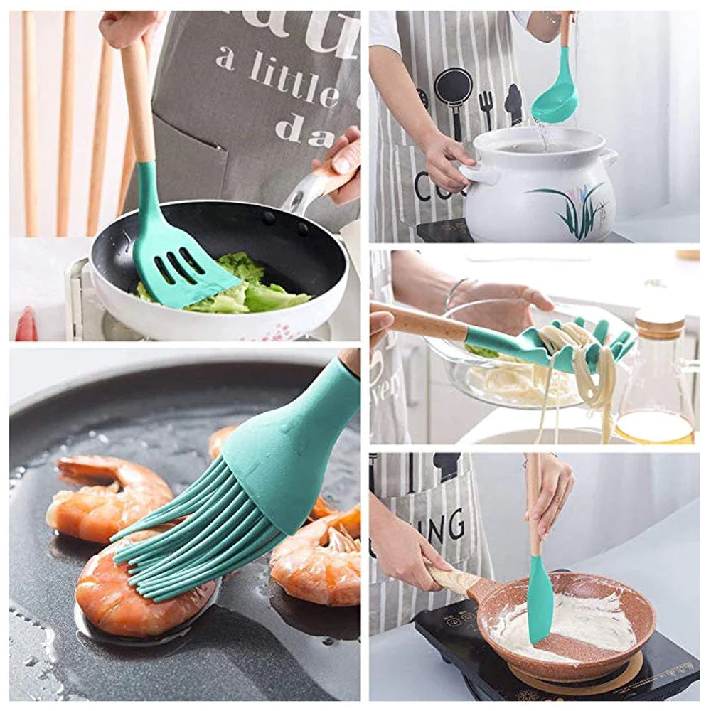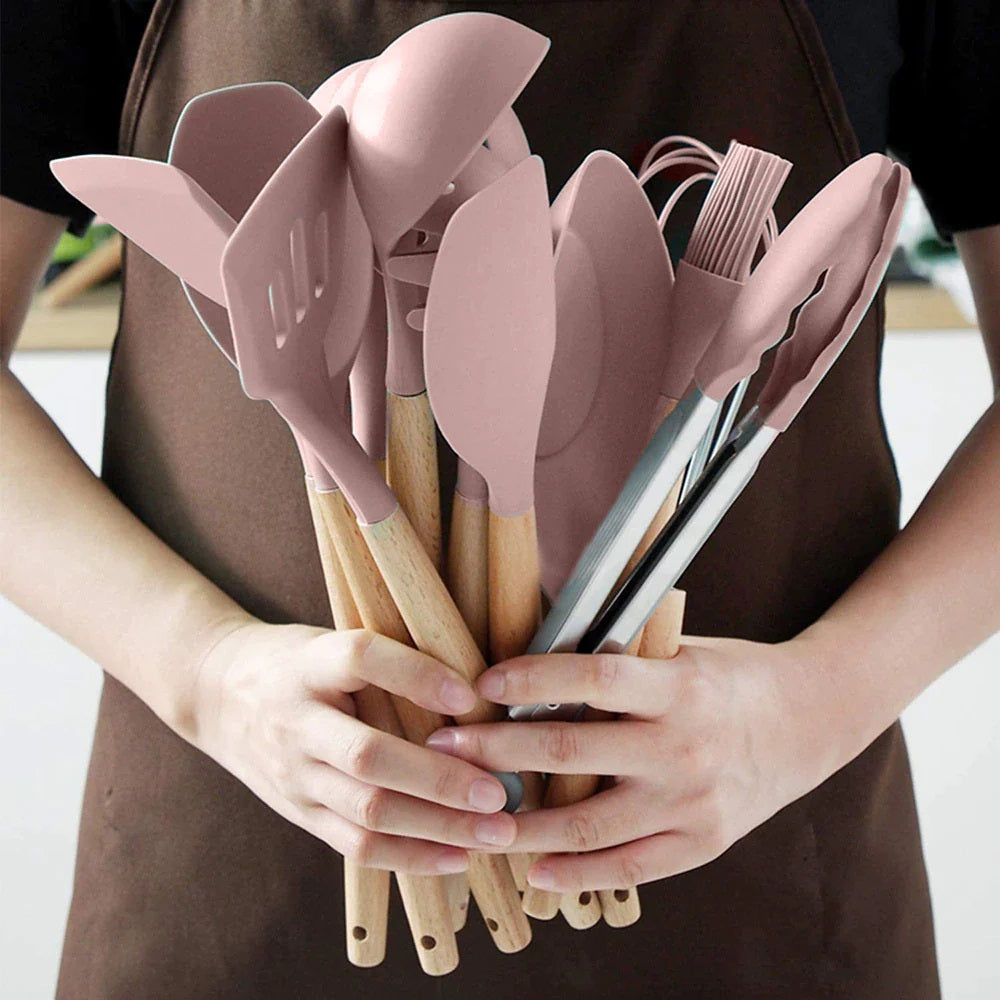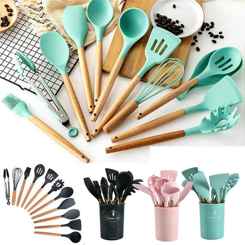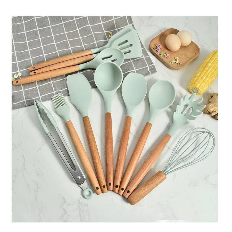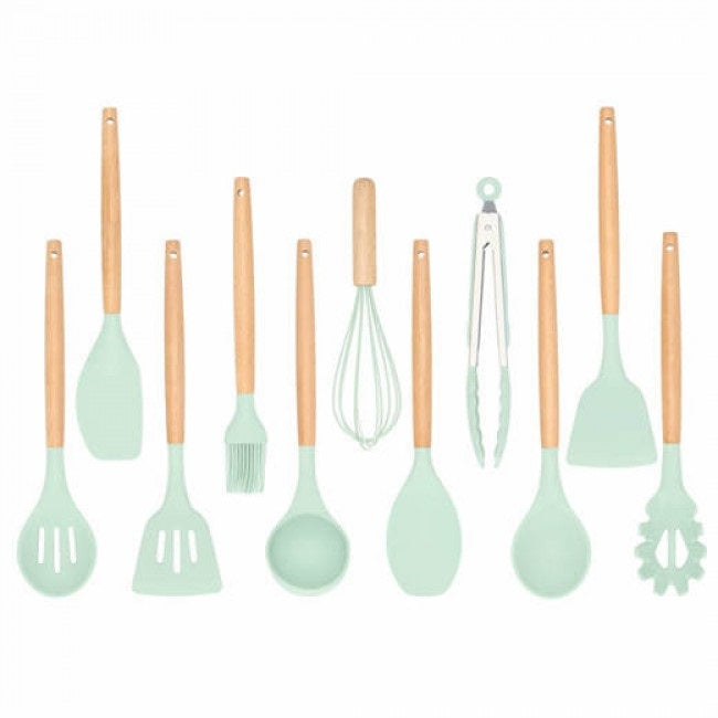 Set 12 ustensile de gatit din silicon, maner rezistent din bambus