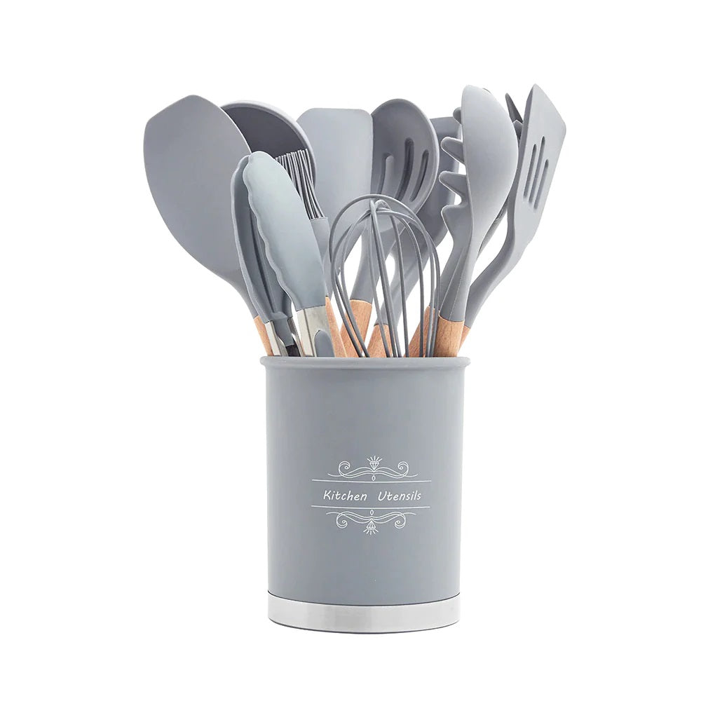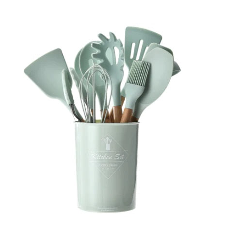 Setul include 12 ustensile diverse, cum ar fi linguri, spatule, paie, teluri, perii si altele. Acestea acopera o gama larga de activitati de bucatarie, de la amestecarea si gatitul la servire si decorare.