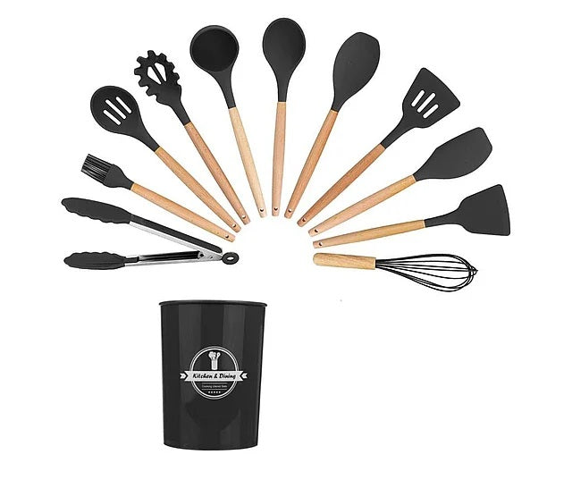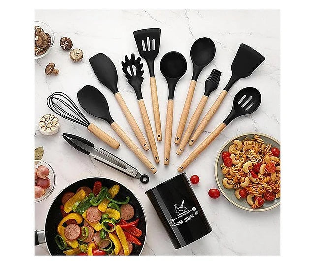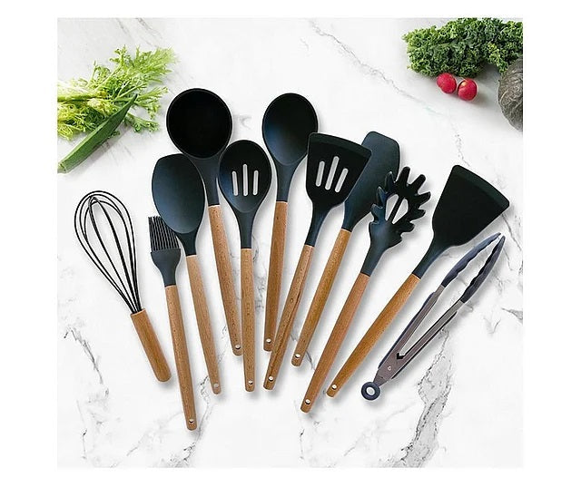 Set 12 ustensile de gatit din silicon, maner rezistent din bambus negre