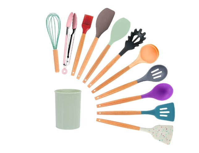 Set 13 ustensile de gatit din silicon, maner rezistent din bambus