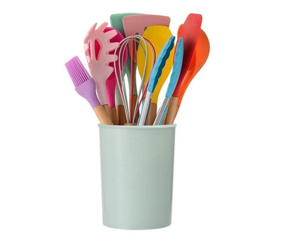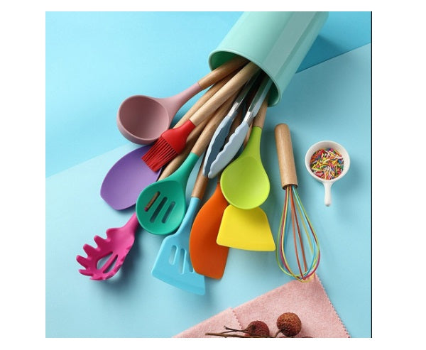 Set 13 ustensile de gatit din silicon, maner rezistent din bambus multicolore