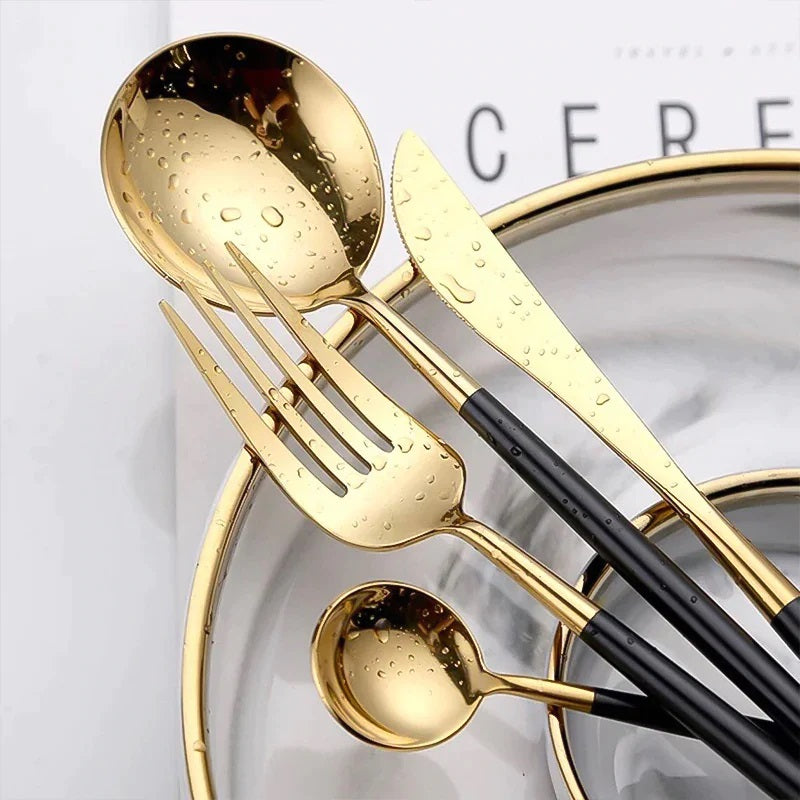 Set 24 de tacamuri, 6 persoane, otel inoxidabil, negru cu auriu