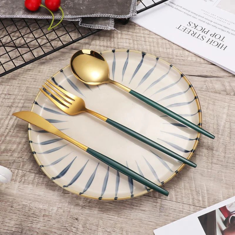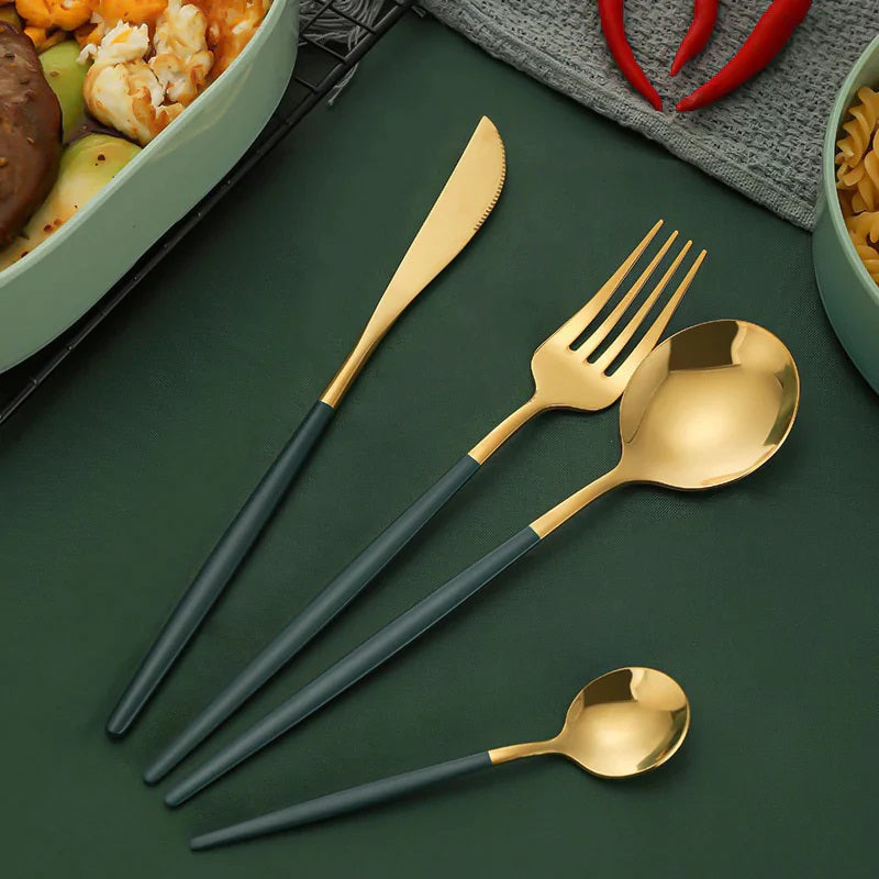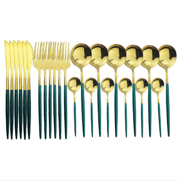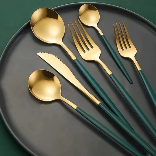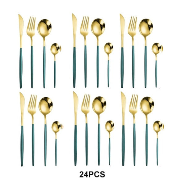Set 24 de tacamuri, 6 persoane, otel inoxidabil, verde cu auriu